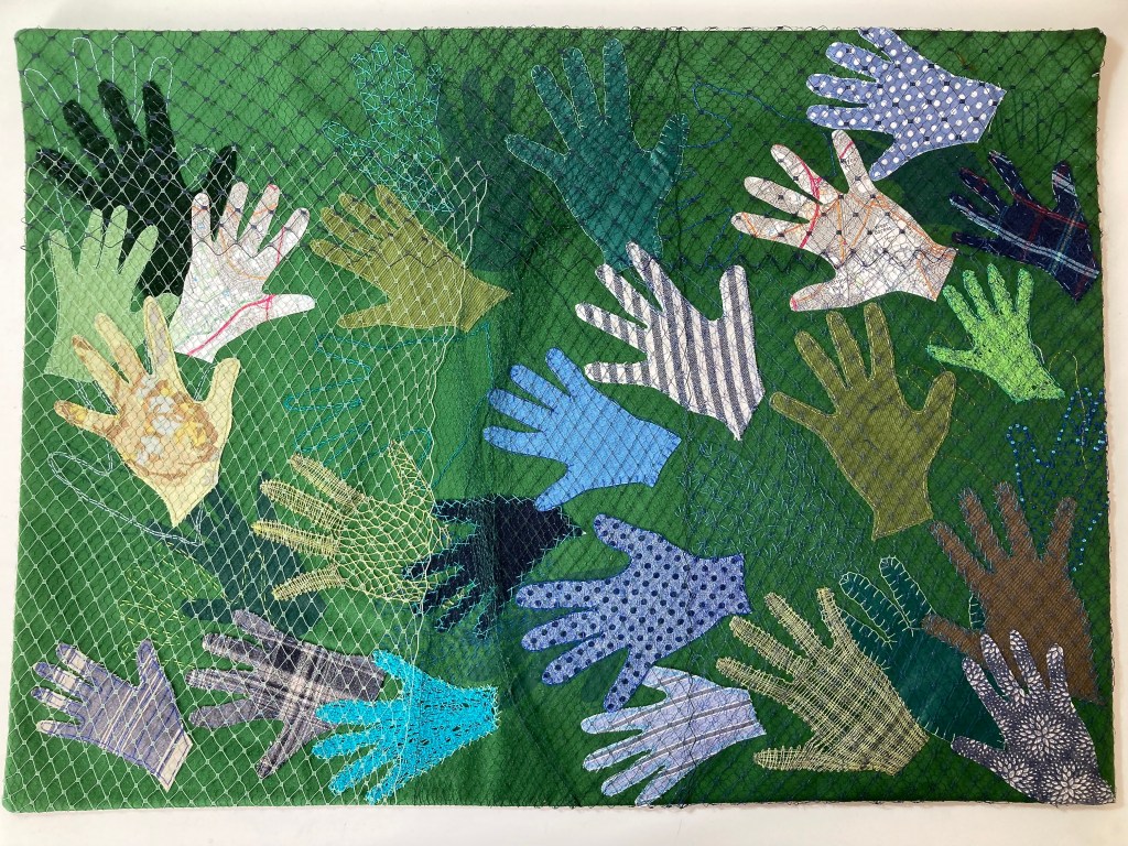 At the exhibition, visitors were invited to leave an outline of their hand that was translated into fabric and then included in this quilt. It was completed after the exhibition and “unveiled” at Art in the Park at Canizaro Park on Sunday 28th September and shown below: