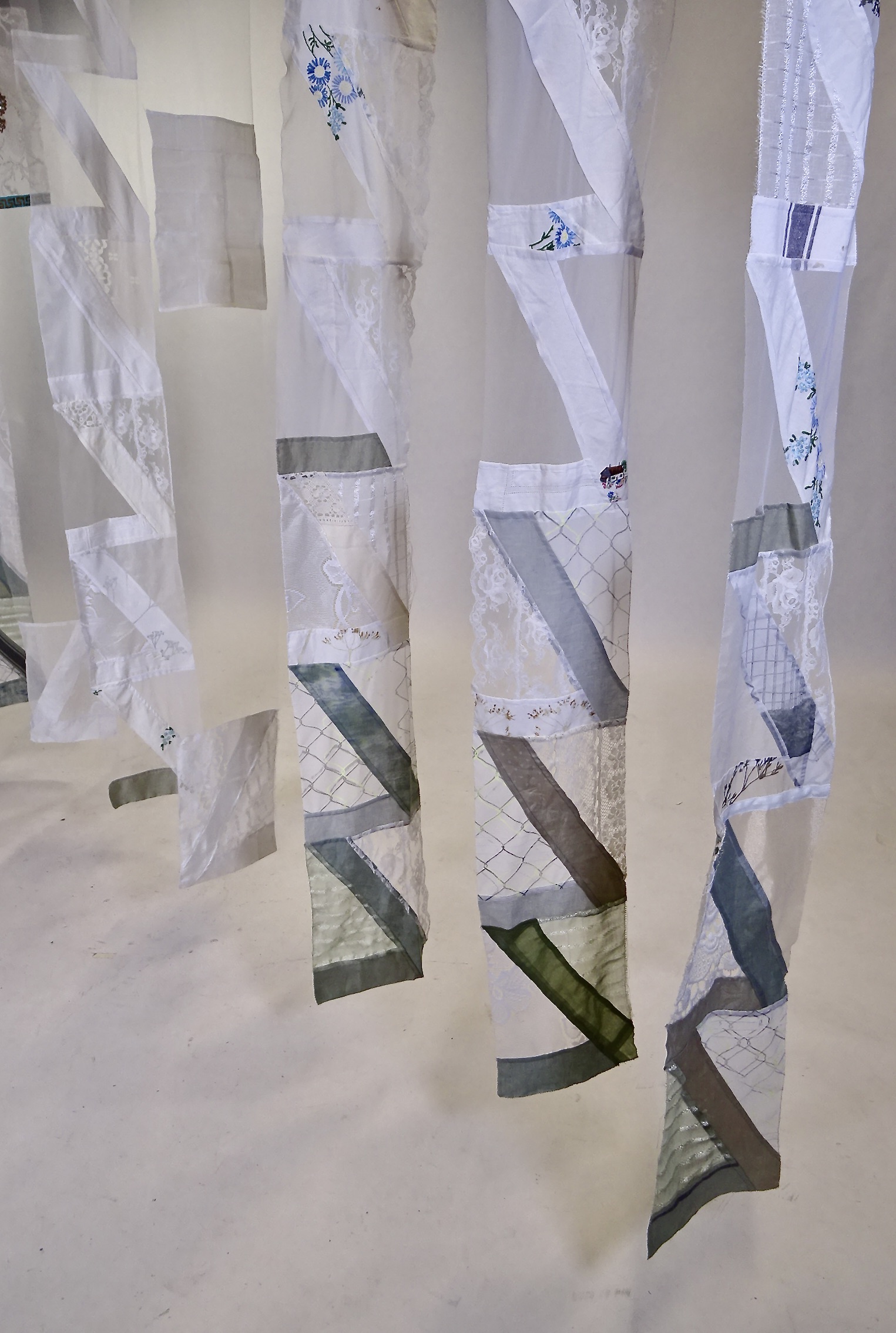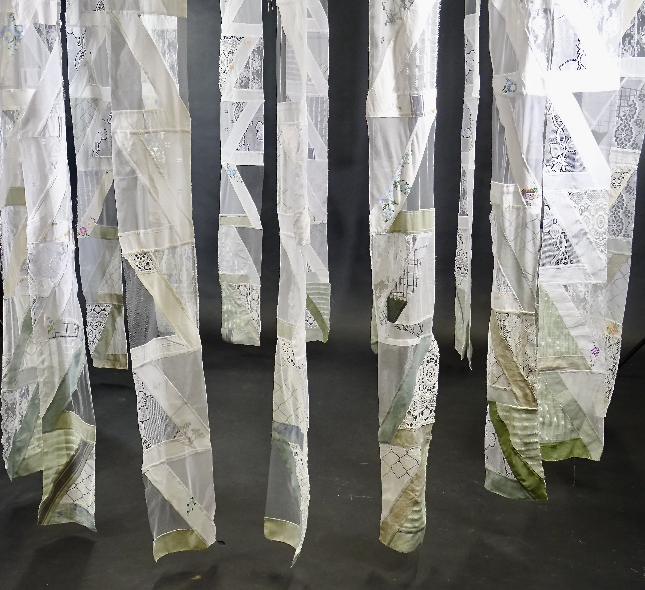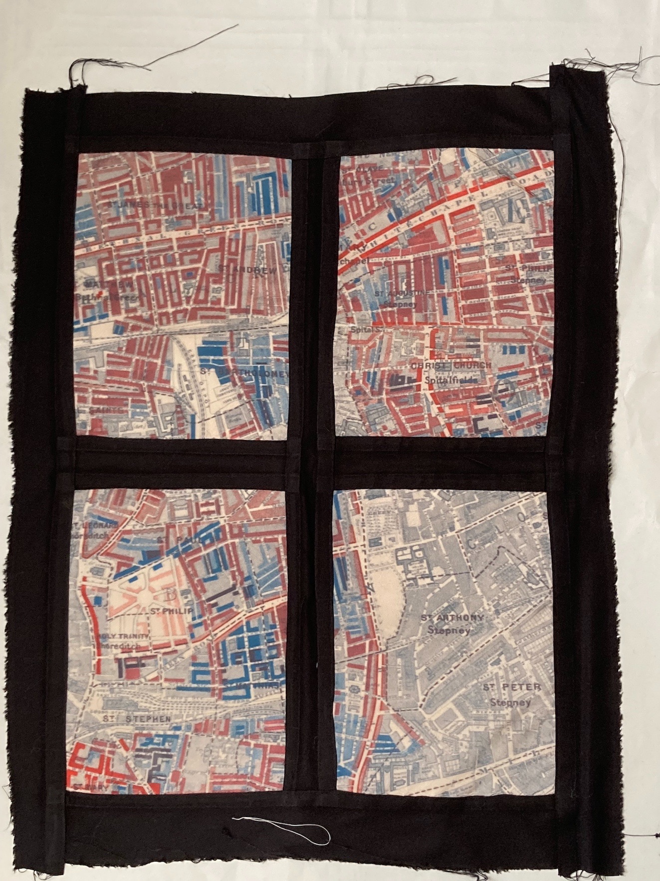 My proposal for a large textile piece is a life-size (4metres wide) Weaver’s window constructed out of textile. It will feature “panes of glass” that are printed maps of the area made by Charles Booth (at https://booth.lse.ac.uk/map) and surrounded by brick patchwork.