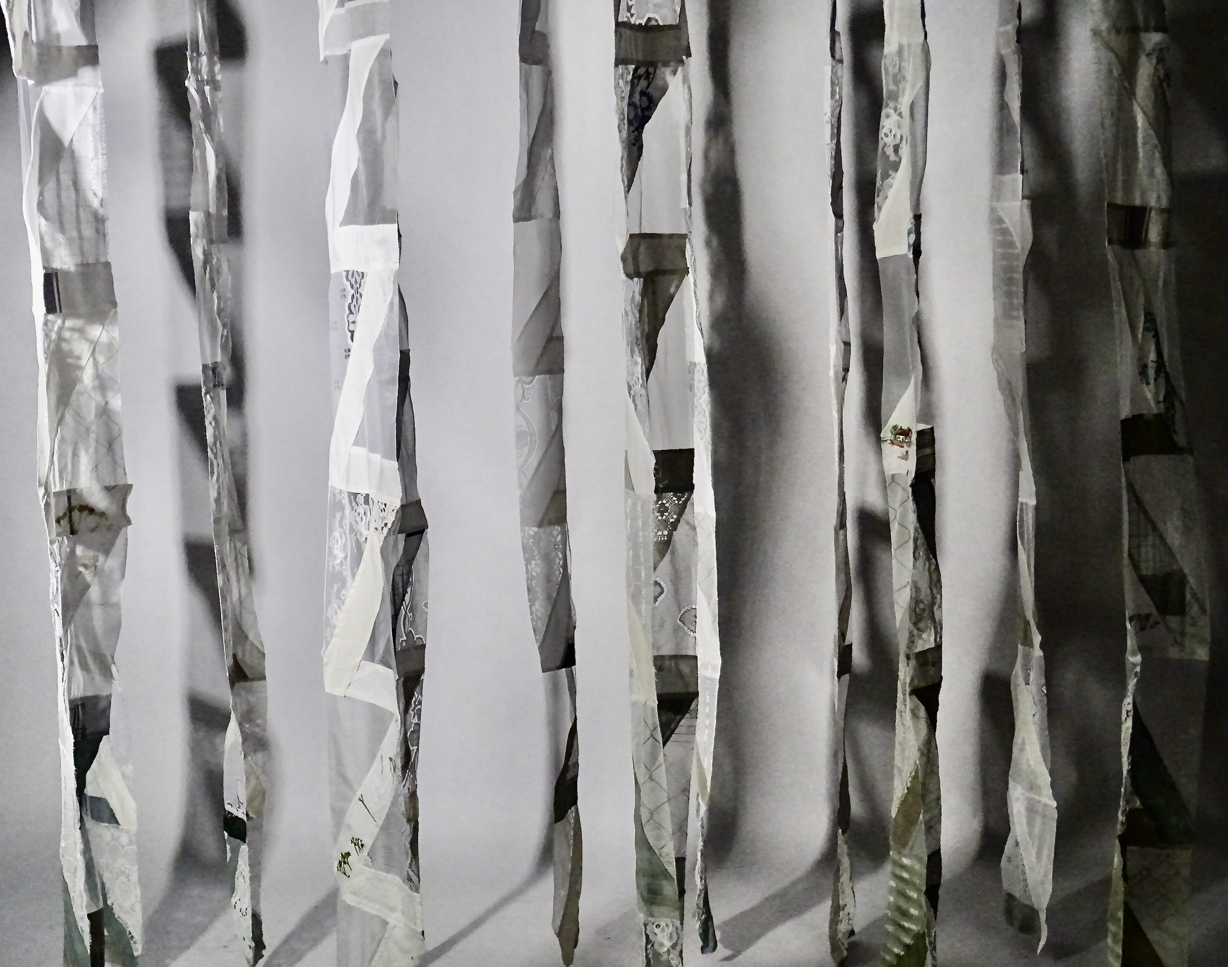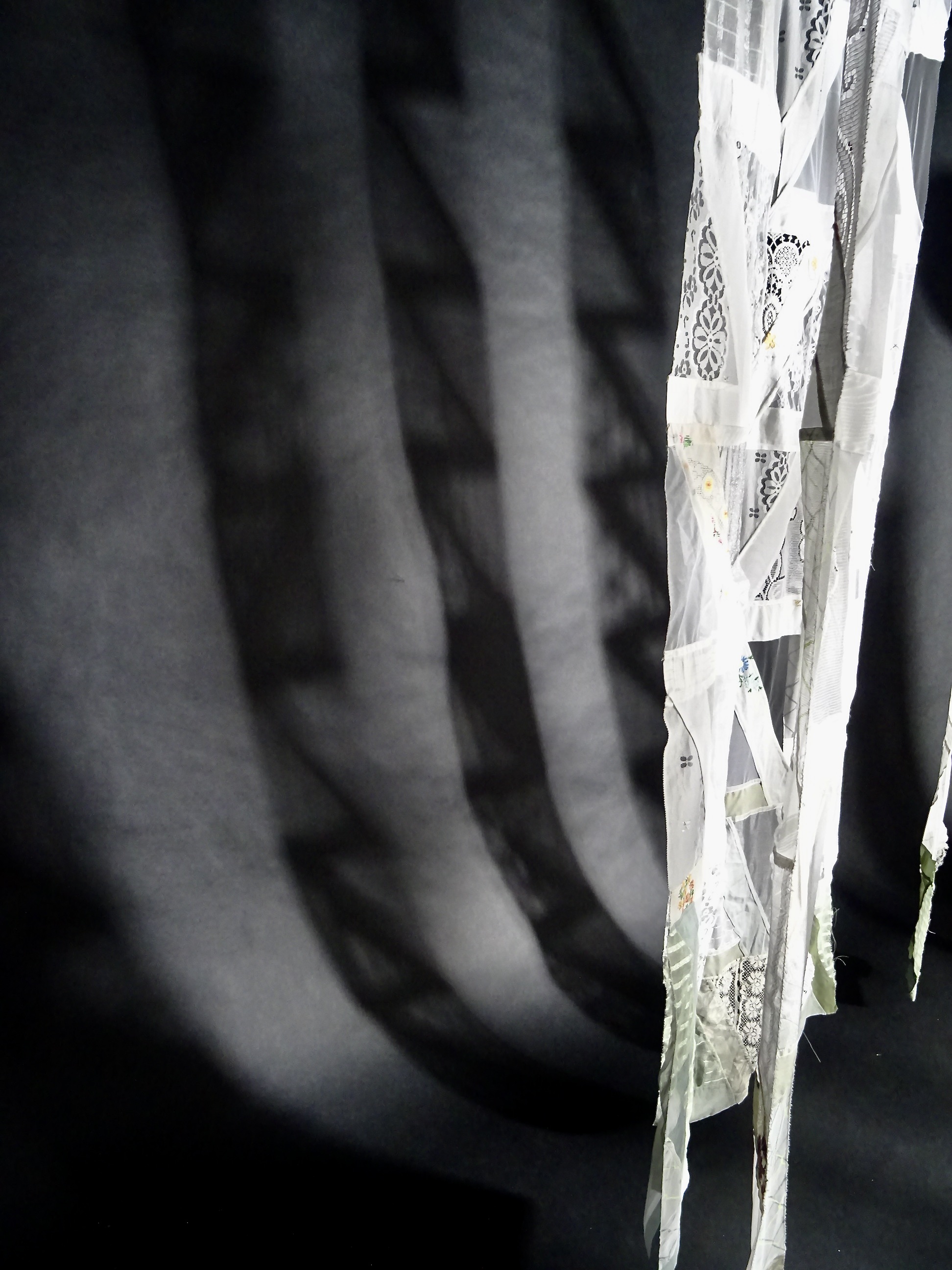 This is a textile representation of the Motspur Park gas holders using only found or existing materials. The discarded domestic textiles (net curtains, doilies, curtains, tea towels, antimacassars, tablecloths, bedsheets) have been sourced from local charity shops, donations from friends, from deadstock suppliers and a used linen warehouse.
