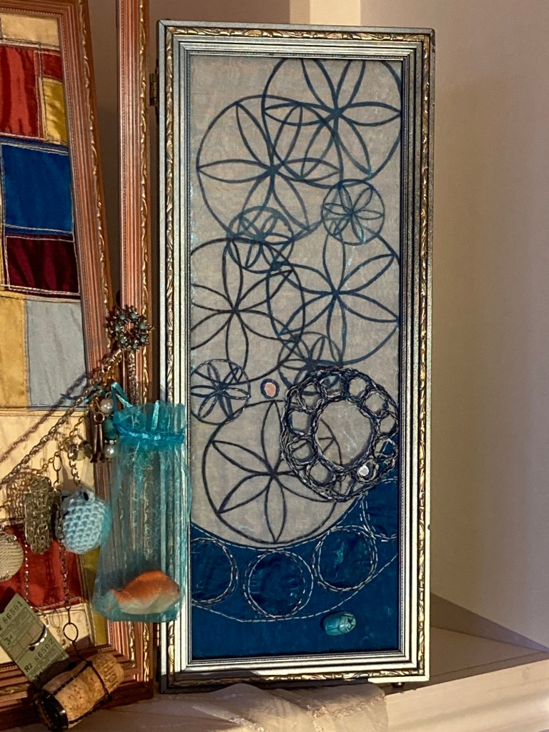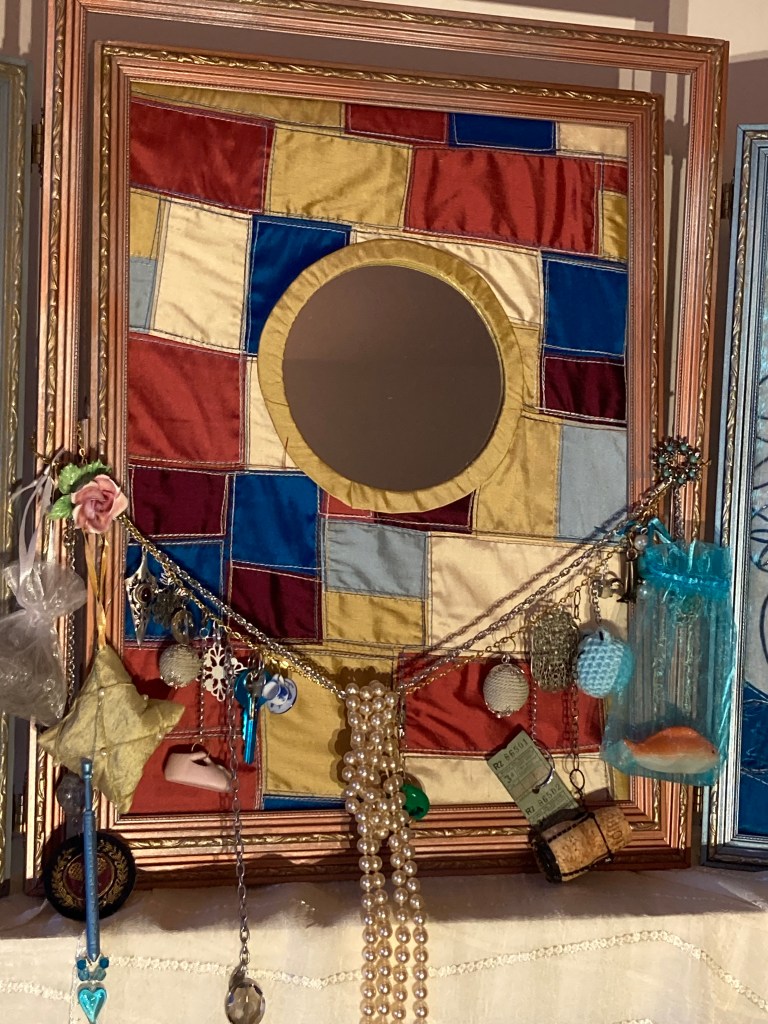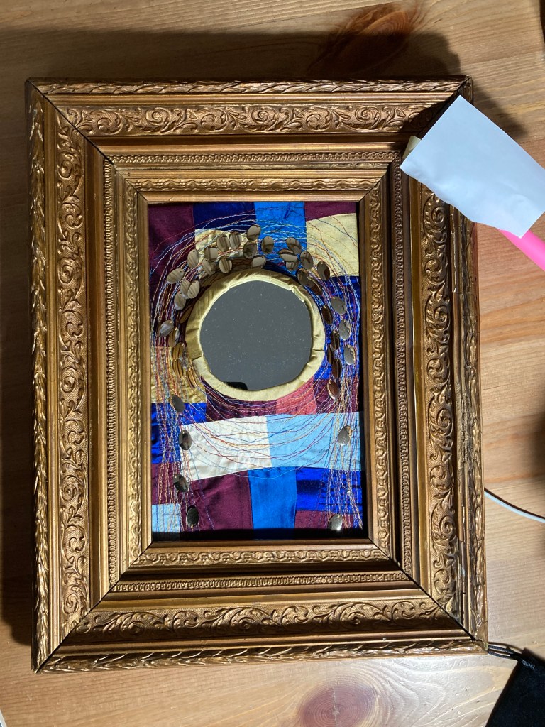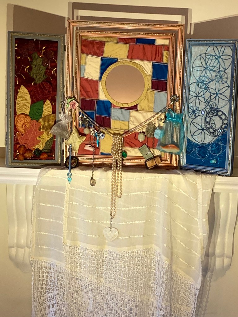 In the centre of the tryptich, we see our own reflection in the guise of a traditional religious icon with suspended personal tokens and offerings, surrounded by nature and talismanic symbols and all set upon an altar.