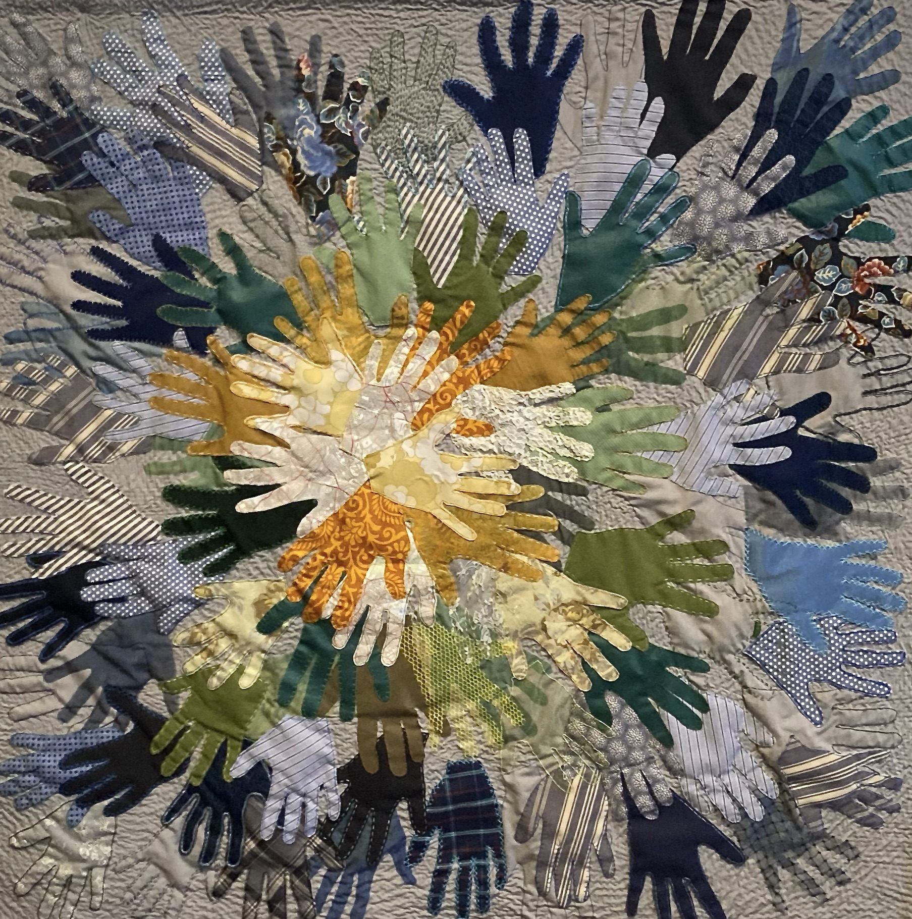 My quilt made using hand outlines collected in summer 2025 entitled “A Kindness of Strangers” was presented at the Wimbledon Art Fair. The finished quilt is going to go out “on tour” and the first exhibition venue was St John’s Church on Spencer Hill, Wimbledon, where it was on show for several months inside the church.