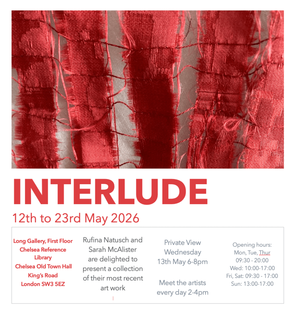 Save the dates for my next exhibition, Interlude, alongside artist Rufina Natusch at the Long Gallery in Chelsea Library. Starting on Tuesday 12th May to Sunday 24th May. One or both of us will be on site 2-4pm every day.